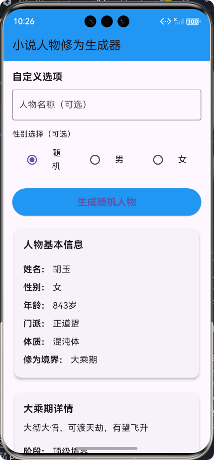 小说人物修为生成APP是一款专为小说作者和爱好者设计的工具型应用,用于随机生成具有不同修为境界的小说人物。用户可以自定义人物名称和性别,系统将自动生成包含年龄、门派、体质和修为境界等详细信息的人物卡片。