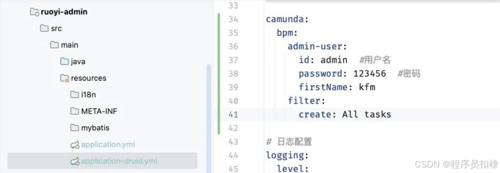 为了正常登录 Camunda 后台,需要在 application.yml 中配置管理员信息与过滤条件: