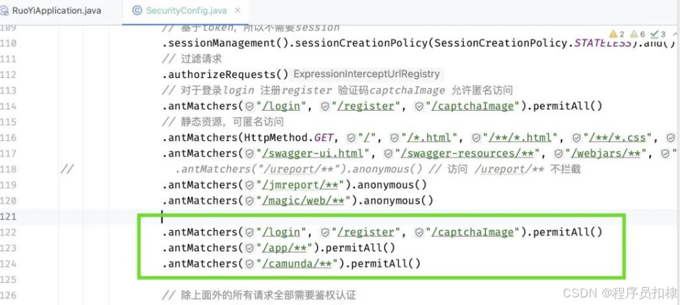 Camunda Web 管理界面需要对静态资源、API 接口开放访问,因此需在 ruoyi-framework 模块中的 SecurityConfig.java 添加匿名放行策略: