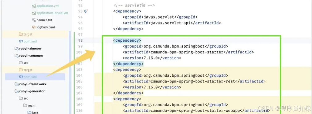 在 ruoyi-common 模块的 pom.xml 中引入 Camunda Spring Boot Starter 相关依赖: