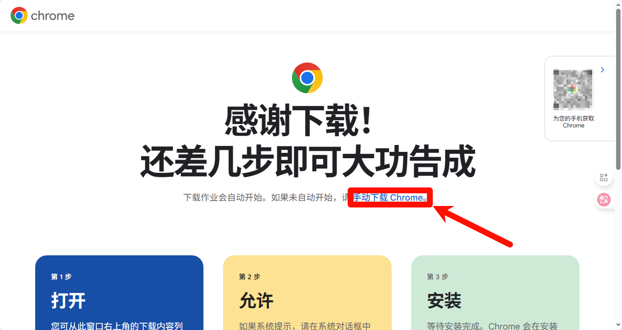 2.出现这个页面会自动下载(没下载的话点击"手动下载Chrome")