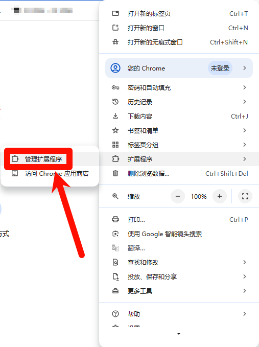 4.点击"扩展程序",点击"管理扩展程序"