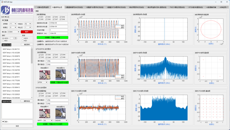 多通道信号生成与多种自定义波形图传实验,支持单音、PSK、OFDM 等多种调制方式,以真实图片为信源,实现8通道独立或同步 的收发与图传演示。直观展示多天线并行处理能力,适合MIMO、分集接收等教学与前期验证。