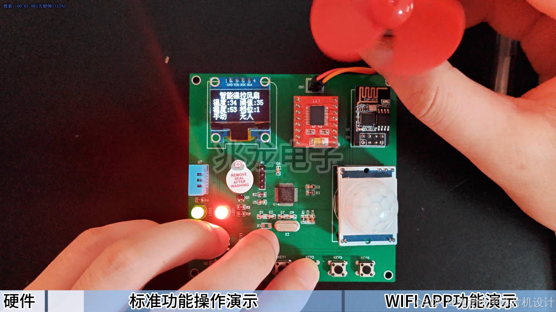 (1) 采用OLED显示屏实时显示当前温度、湿度、温度阈值、风扇档位、人体存在状态以及工作模式(自动/手动/定时);