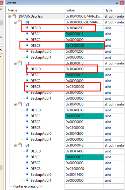 __attribute__((at(0x30040000))) ETH_DMADescTypeDef DMARxDscrTab[ETH_RX_DESC_CNT]; /* Ethernet Rx DMA Descriptors */