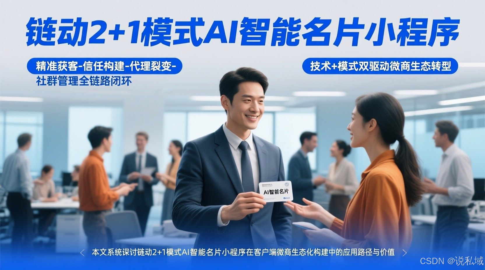 链动2+1模式AI智能名片小程序的出现,为破解上述痛点提供了新的思路。该载体融合了链动2+1的裂变营销机制与AI智能名片的技术赋能优势,以小程序为轻量化入口,实现了"精准获客-信任构建-代理裂变-社群管理"的全链路闭环。链动2+1模式通过"直推2人晋升、帮扶下级成长"的核心规则,降低了代理准入门槛,强化了团队协同动力;AI智能名片则依托用户画像、智能交互等技术,助力意见领袖形象塑造与客户需求精准匹配。二者的有机结合,不仅重构了客户端微商的运营逻辑,更推动了其生态化构建从"经验驱动"向"技术+模式双驱动"转型。本文以此为研究核心,系统探讨链动2+1模式AI智能名片小程序在客户端微商生态化构建中的应用路径与价值。