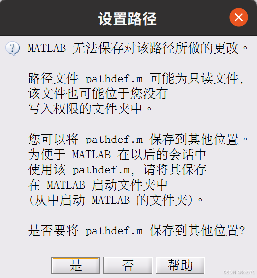 在使用matlab R2018a设置路径时,出现如图所示问题,"路径文件pathdef.m为只读文件无法保存到matlab启动文件夹的问题"