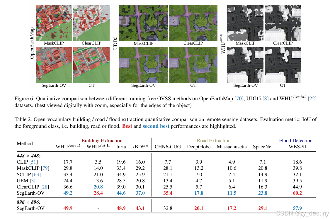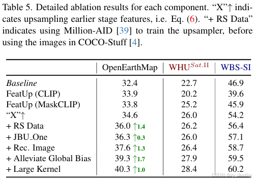 论文在17 个遥感数据集(覆盖 4 类任务)上进行了全面验证,对比 5 种主流训练无关 OVSS 方法(CLIP、MaskCLIP、SCLIP、GEM、ClearCLIP),核心结果如下: