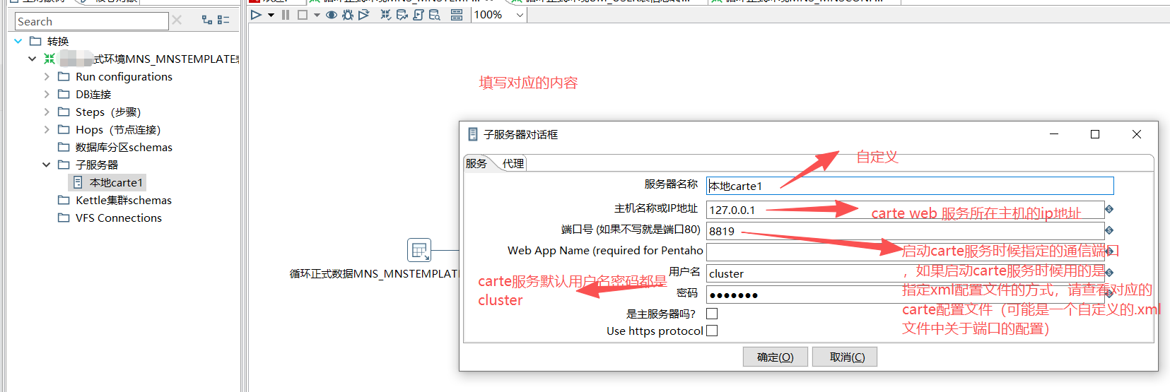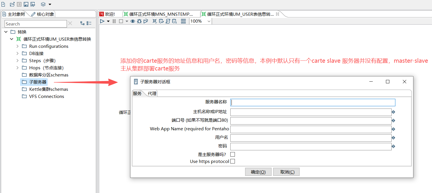 第二步spoon与carte服务的通信连接配置,就是通过.ktr任务配置文件的子服务器选项来配置
