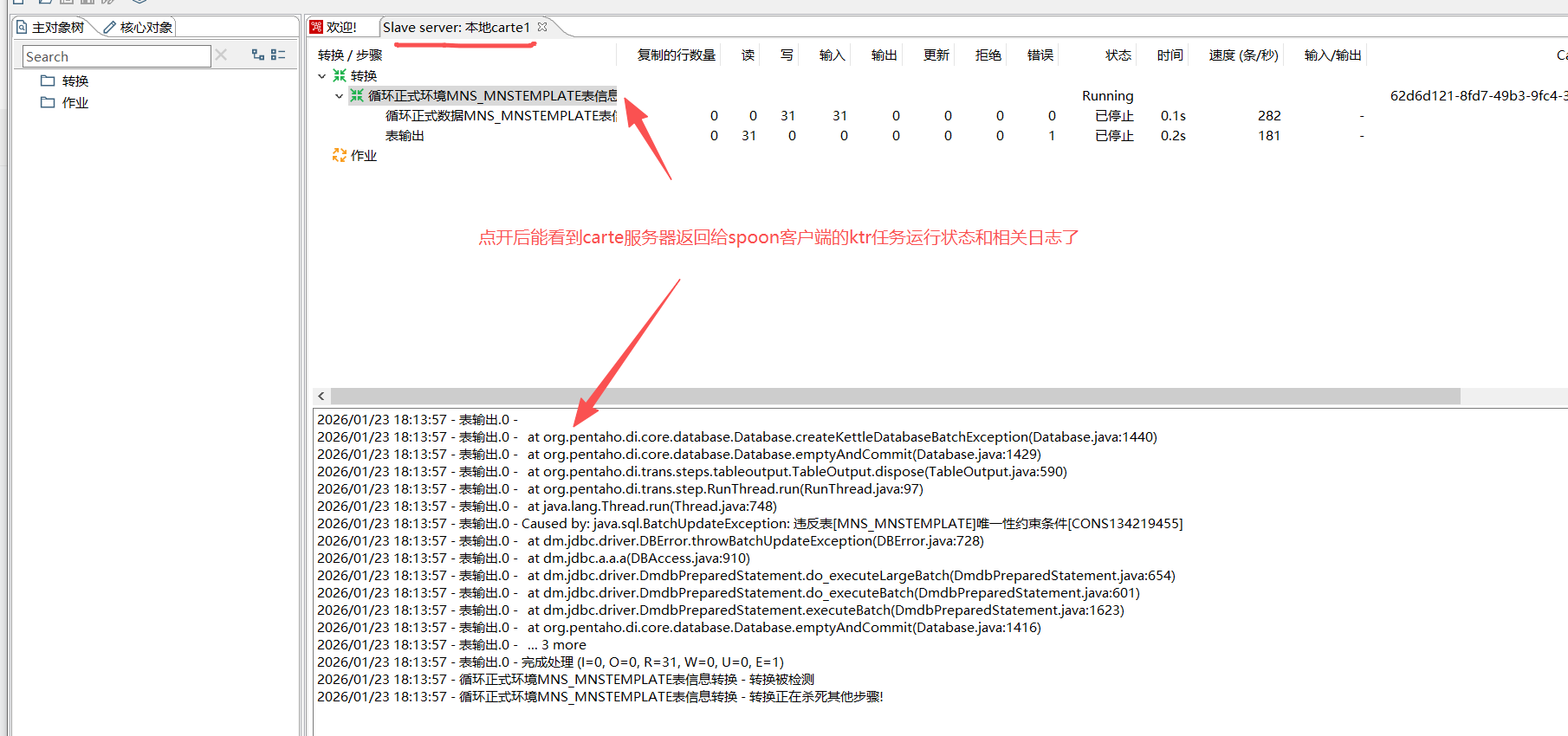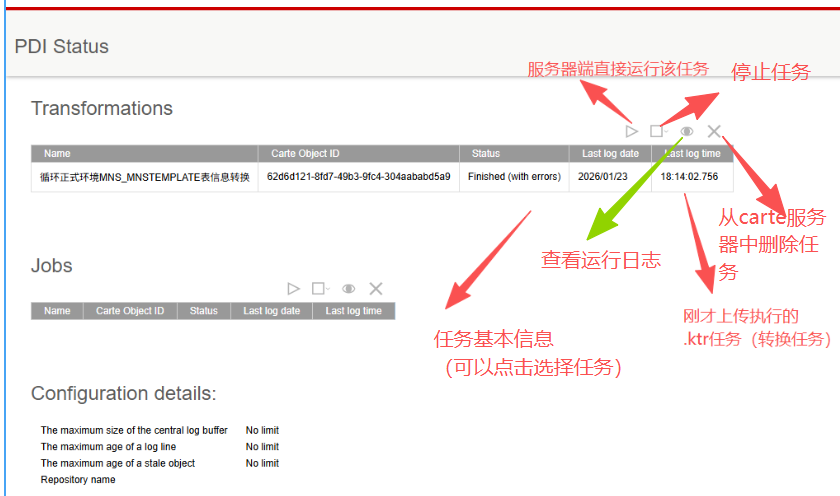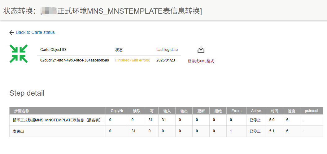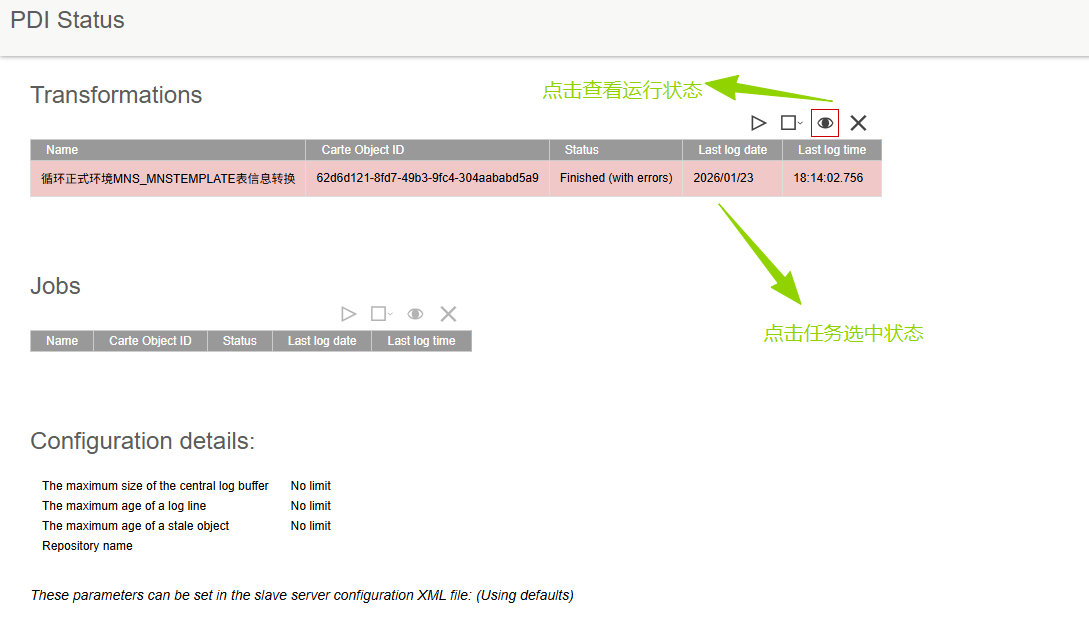 你也可以远程连接到已经启动好的carte的web服务器上查看提交的任务的执行状态(从服务端查看任务执行状态信息),本例中8819这个端口是我在启动carte服务时候特意指定的,默认是8080