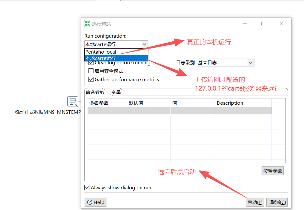 建立好以后,再运行你的.ktr的时候,在运行选项中就有了你配置的远程上传给carte服务来运行.ktr的选项了