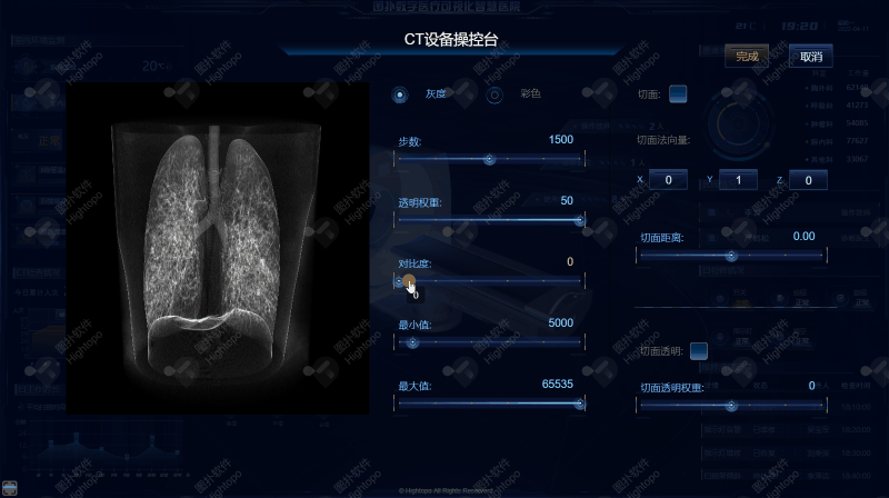 - **CT 检查可视化与设备操控:**通过 DICOM 接口获取 CT 扫描数据,基于建模软件预先构建的人体部位三维模型,实现扫描过程的动画演示。开发设备操控面板,通过 JavaScript 绑定控件事件,调用 HT 的模型属性修改 API,实现 CT 检查时的灰度调整、切面控制、对比度调节等功能。