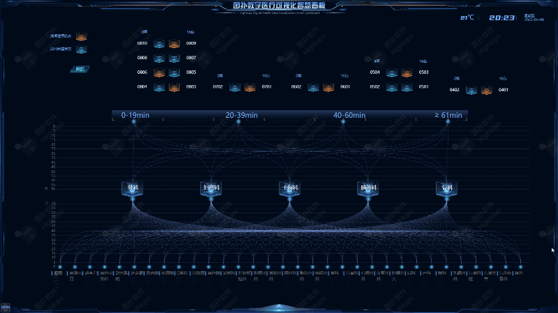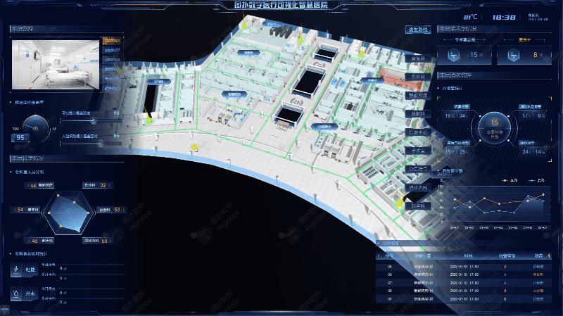 - **楼层数据多维整合:**通过接口对接医院 HIS、EMR 等系统,获取楼层科室分布、工作人员信息、挂号数据、手术室使用状态等多源数据。采用数据标准化处理技术,统一数据格式后存储于前端缓存,实现楼层环境、人员、设备等信息的实时动态刷新。