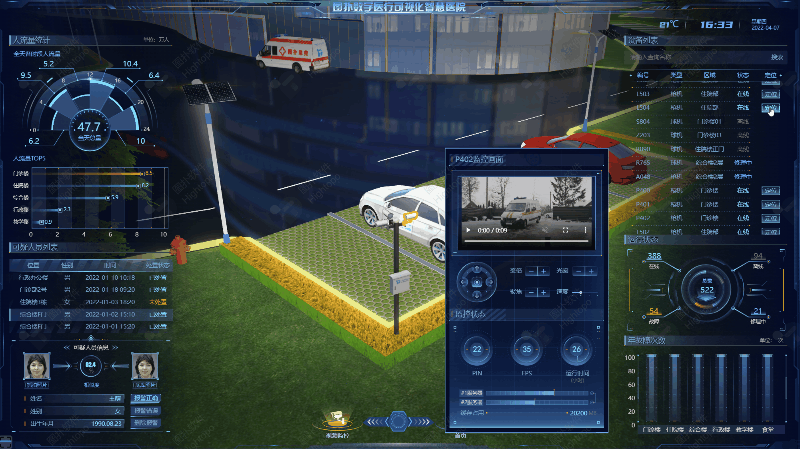 - **HUD 技术融合应用:**借鉴车辆 HUD 系统设计思路,通过 HT 的图层叠加 API,将手术时间、手术台数、房间状态等关键信息以线条形式叠加展示在 3D 场景中。结合 2D 面板组件,呈现手术总量、设备巡检情况、维护率等统计数据,实现诊疗信息的集中展示与数据分析。