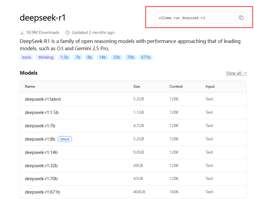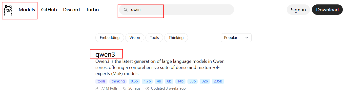 在models搜索你需要的模型(本地机器可以先从4B开始尝试、好的机器可以跑更大的模型 )