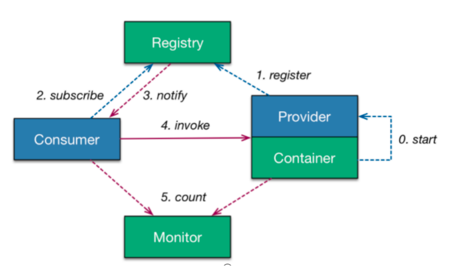 Container(容器)、Provider(服务的提供方)、Registry(注册中心)、Consumer(服务的消费方)、Monitor(监控中心)