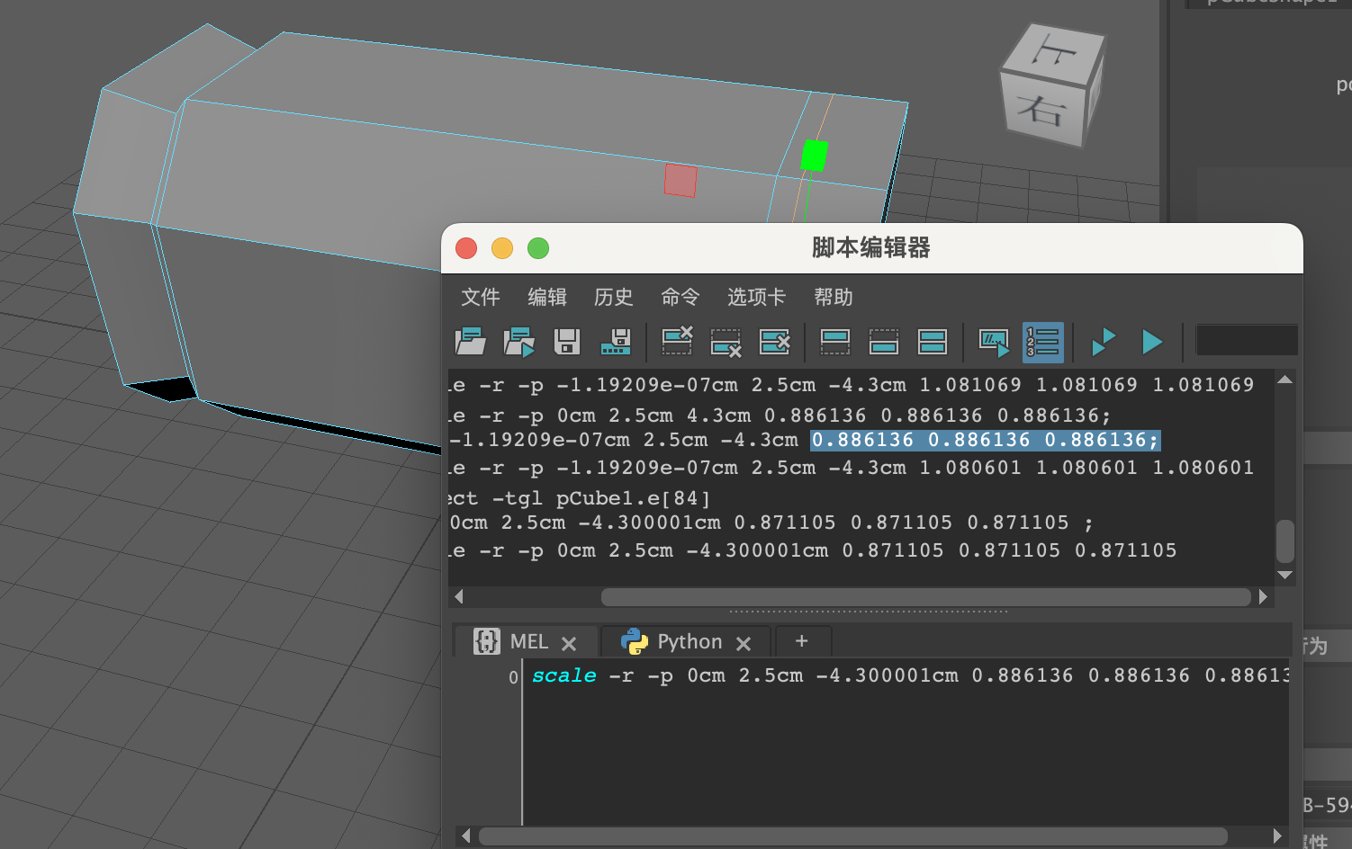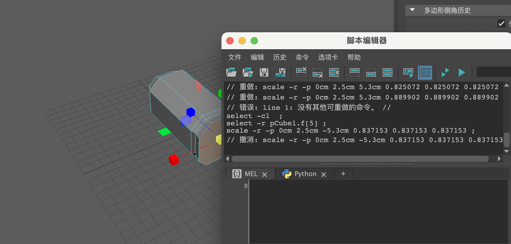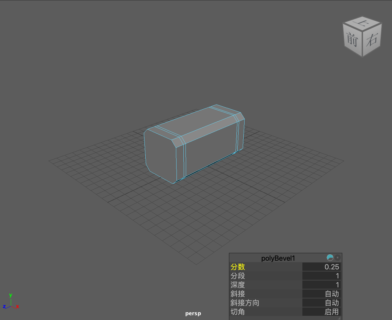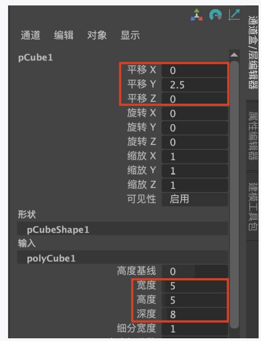 (1)启动中文版Maya 2024软件,单击"多边形建模"工具架上的"多边形立方体"图标,在场景中创建一个长方体模型。(2)在"通道盒/层编辑器"面板中,设置长方体的参数值