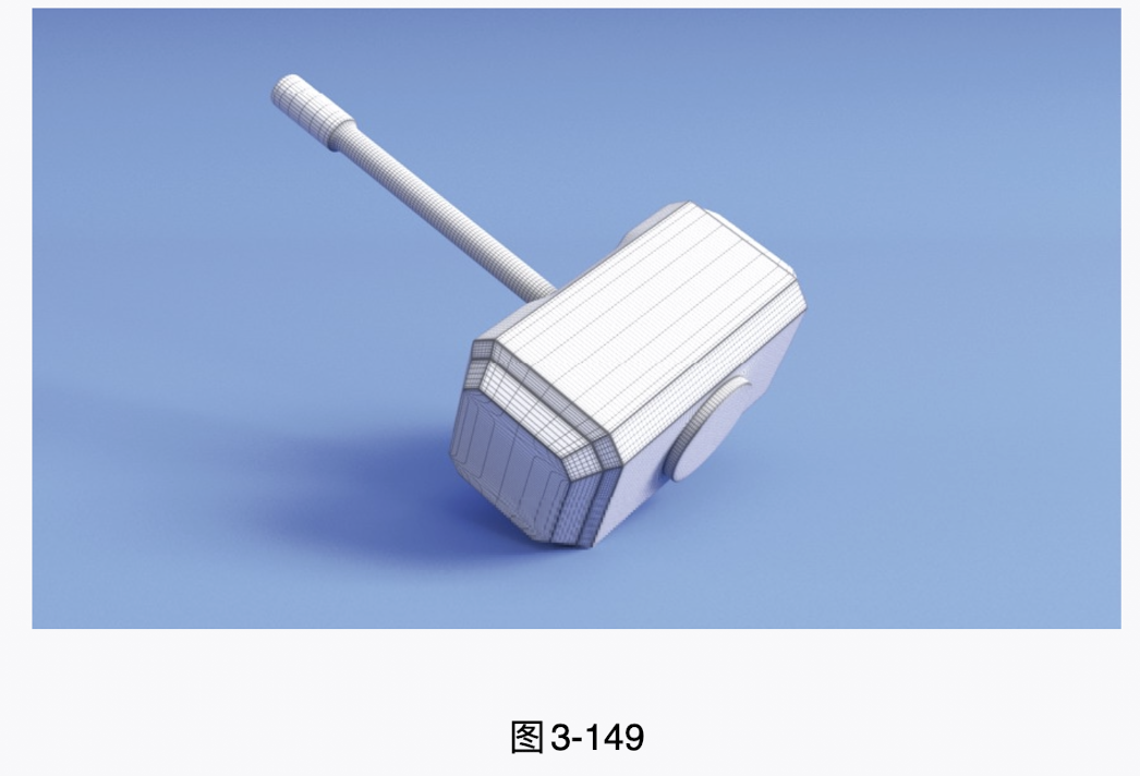 在本实例中,笔者将详细讲解如何使用中文版Maya 2024为我们提供的建模工具将一个多边形长方体变成一把锤子的模型,锤子模型的最终渲染效果如图3-148所示,线框渲染效果如图3-149所示。