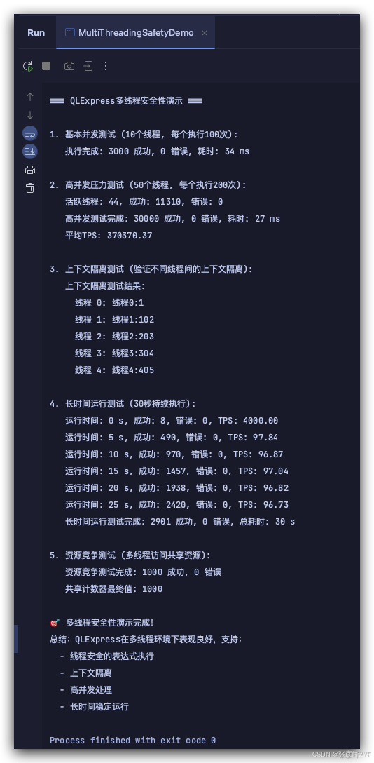 现在我们尝试以一份完整、可运行的多线程演示代码为基础,从工程视角出发,通过多组并发实验,系统验证 QLExpress 在不同并发强度和使用方式下的行为表现,并结合框架设计原理,总结出一套可落地的多线程使用实践与规范。