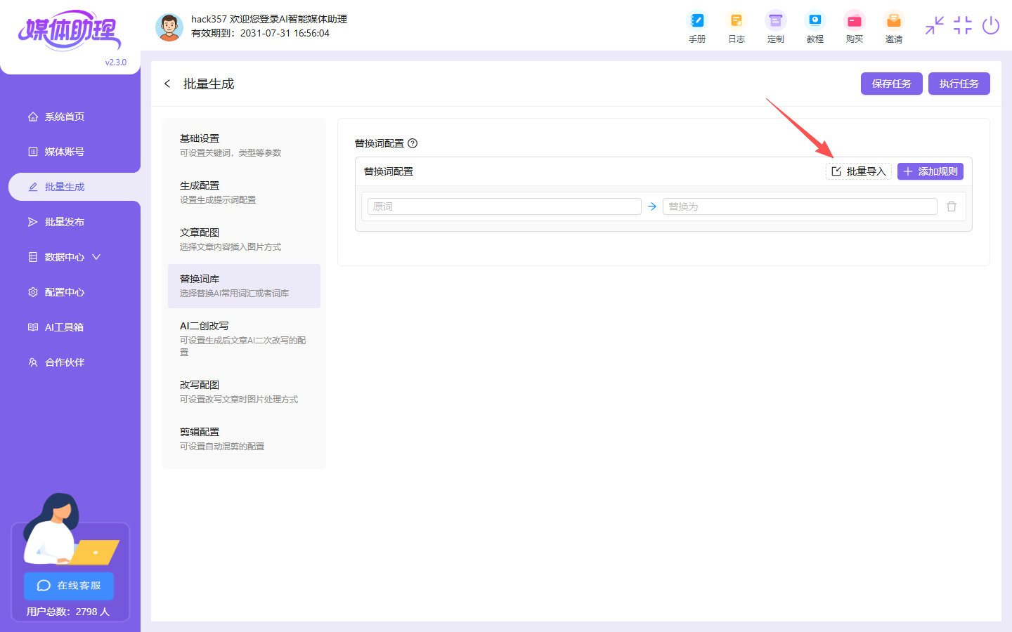 然后就是替换词库,替换词这里是我们可以替换掉一些我们不想要的词,或者是同义词的,比如清晨>早晨,这就是当生成中有清晨的时候会自动替换成早晨
