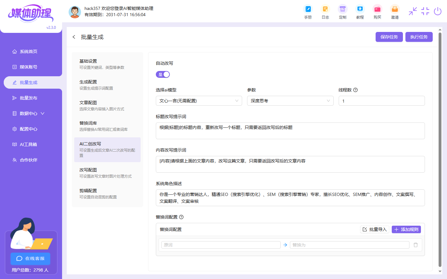 下一步是AI改写,这里是有开关的,如果打开:生成、改写、保存,如果关闭:生成、保存,这是步骤,大家可以自由设置,如果开启改写了,这里也是要用提示词来控制改写的风格的