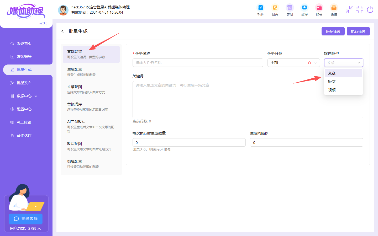 添加任务我们可以选择任务名称、文章分类、文字类型(长文、短文、视频)这里要注意,抖音、小红书是不可以发布长文的,只能发布短文笔记的