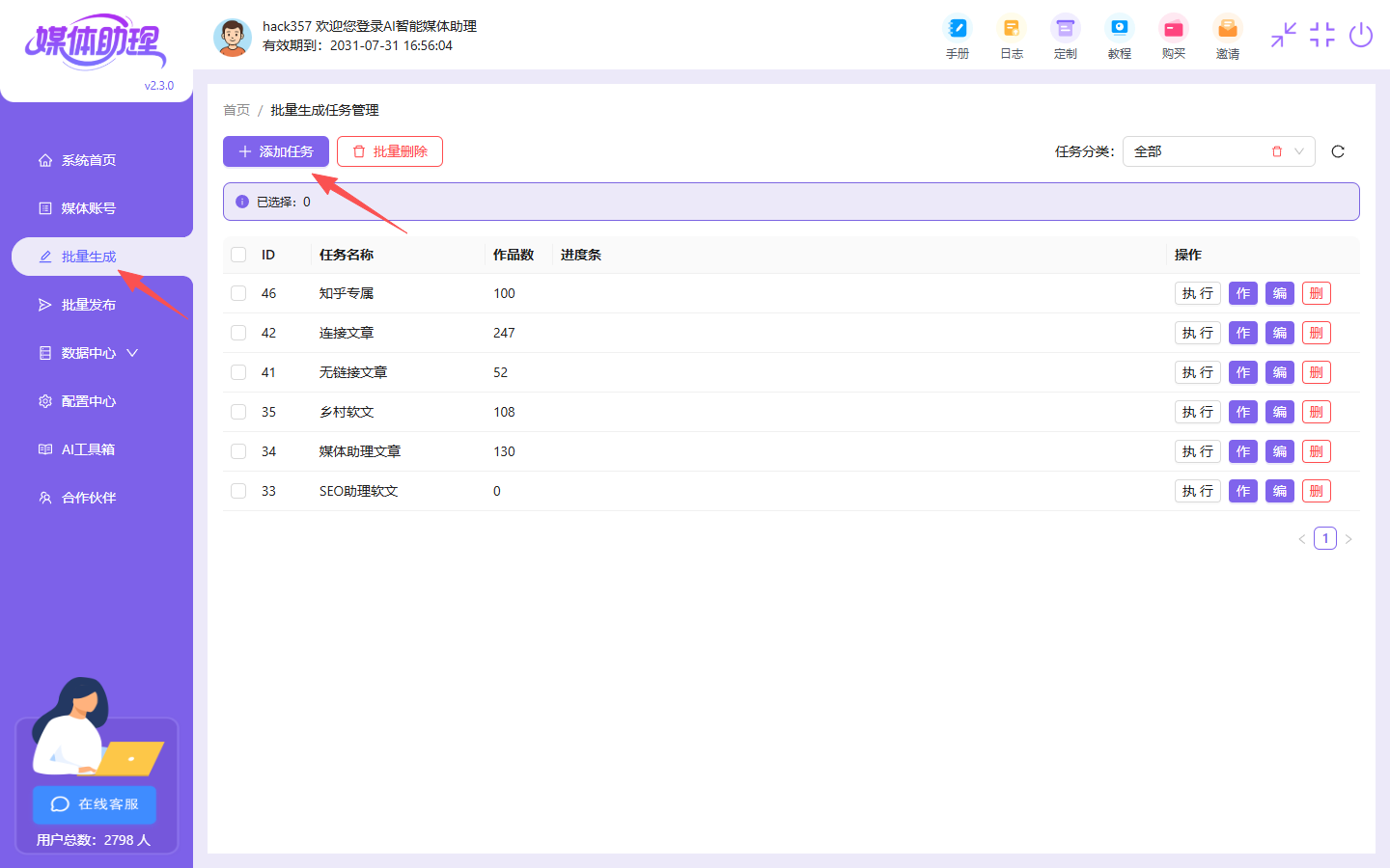 配置批量生成文章的任务我们可以创建多条,让他同时进行生成任务