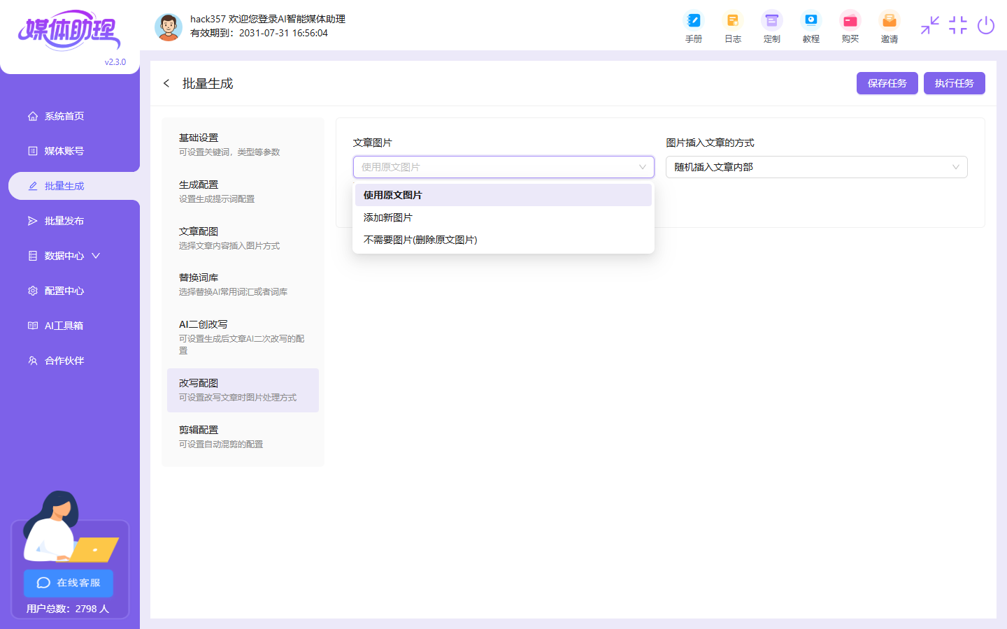 包括改写文章中的图片可以选择使用原来图片,或者删除原来图片不要,还可以选择使用新的配图,以及图片的插入方式,头部、尾部、随机位置