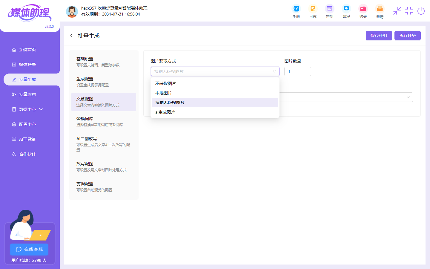 生成配置的AI模型、提示词设置好以后我们可以选择文章配图,配图的方式有3种,本地图片、搜狗图片、AI生成图片
