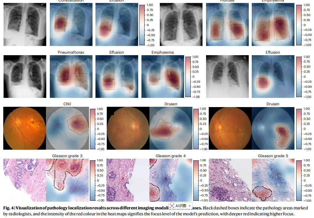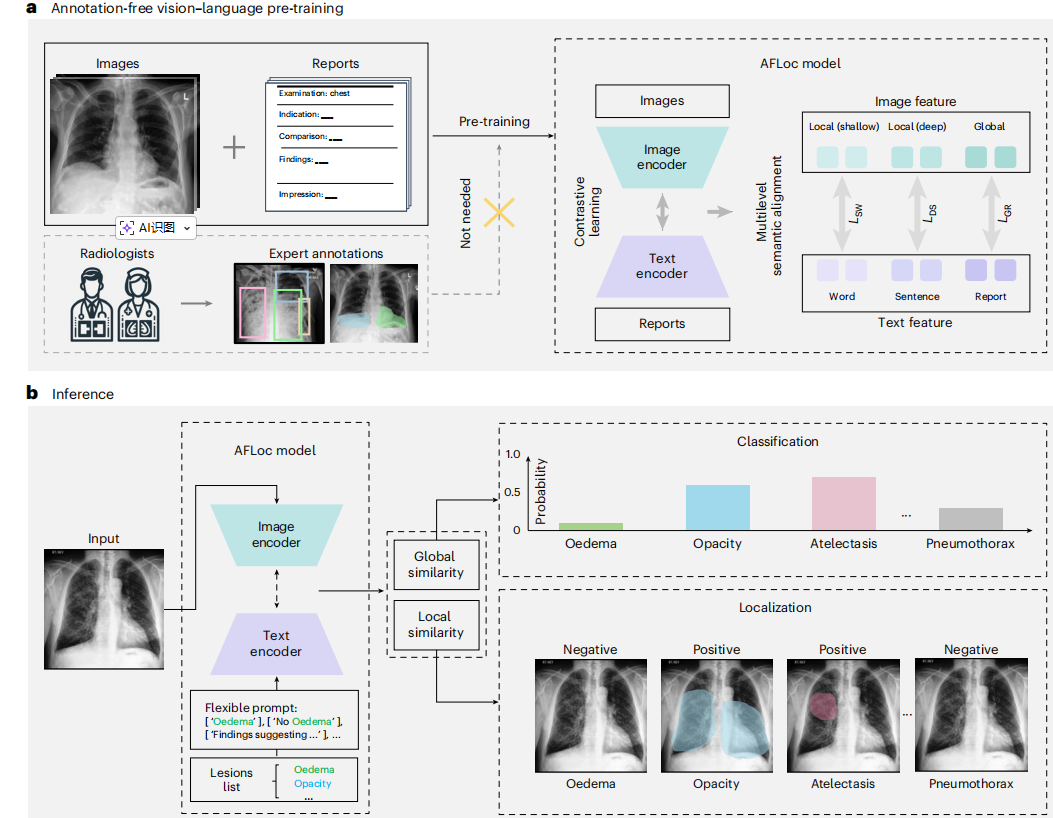这篇发布在Nature上的论文介绍了一种名为 AFLoc 的多模态视觉语言模型,旨在解决医疗影像分析中病灶定位 对专家标注过度依赖的问题。该模型通过多层级语义对齐 技术,将临床报告中的文本信息与医学影像的局部特征进行关联,实现了无需人工标注的自动定位与诊断 。实验结果证明,AFLoc 在胸部 X 线、眼底照影及病理切片等多种影像模态上均展现出卓越的跨场景泛化能力 ,性能优于现有的自监督和无监督学习方法。此外,该系统在实际临床工作流中显著提升了放射科医生的诊断准确率 并缩短了阅片时间。这种无需标注 的开发模式,不仅降低了算法构建成本,也为资源受限地区的医疗诊断提供了极具潜力的智能决策支持。