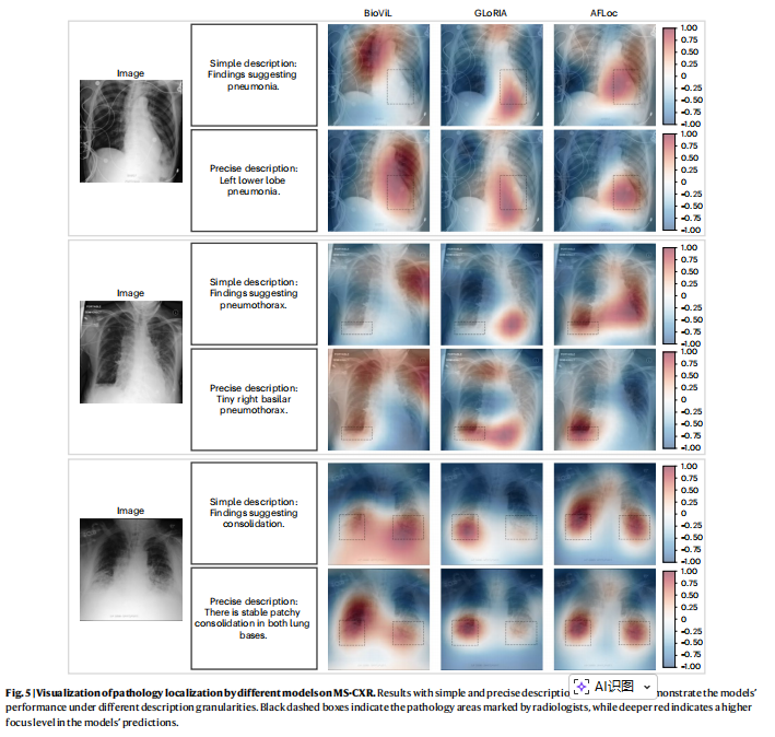 提示词 (Prompt) 的重要性:实验证明,**精确的临床术语描述(Precise description)**比简单的病理名称(Simple description)能显著提升定位精度,。例如,将提示词从"肺炎"改为"左下叶肺炎",AFLoc 的定位会更加聚焦且接近放射科医生的标注。