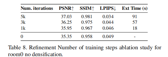 - 3k 迭代为最优权衡,仅增加 57 秒计算时间,PSNR 提升 2.5%,LPIPS 降低 10%。