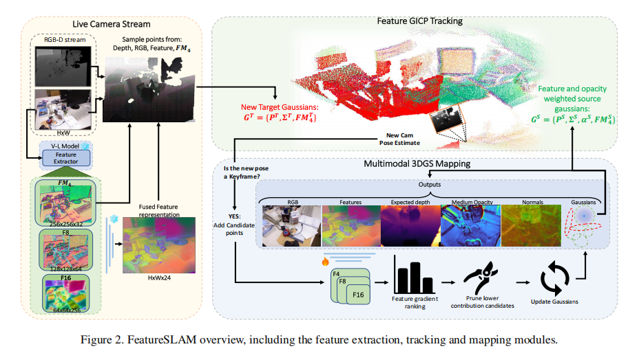 - 如何在实时在线场景下,将多尺度基础模型特征与 3DGS 深度融合,同时保证跟踪速度与地图质量;