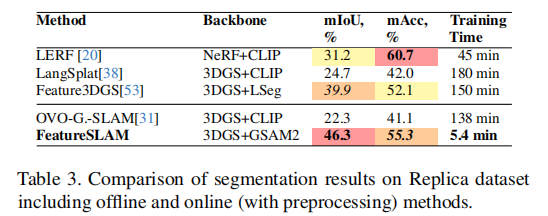 为评估开放集语义理解能力,FeatureSLAM 与离线特征蒸馏 3DGS 方法在 Replica 数据集上进行零样本新颖视图分割对比(表 3):