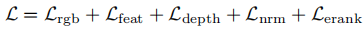 FeatureSLAM 采用多目标损失函数,联合优化外观、特征、深度与几何一致性,总损失为:
