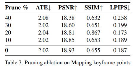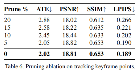 - 跟踪关键帧剪枝率越高,ATE 越大(如 20% 剪枝时 ATE=2.88m vs 0% 剪枝时 ATE=2.02m),但地图规模更小;