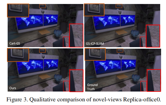 新颖视图渲染对比(图 3)显示,FeatureSLAM 重建的场景细节更丰富,无明显漂浮伪影,边缘轮廓更清晰,优于 CartGS、GS-ICP-SLAM 等方法。