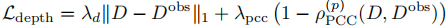 深度损失:融合 L1 损失与 PCC 损失,兼顾绝对深度精度与相对深度结构: