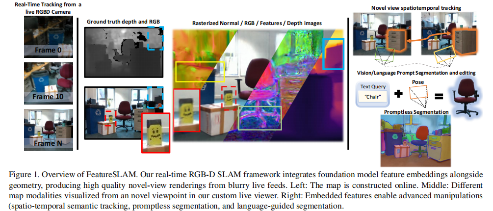 针对这些痛点,来自萨里大学与 I3D Robotics 的研究团队提出了FeatureSLAM------ 一款将基础模型特征嵌入与 3D 高斯溅射相结合的实时 RGB-D SLAM 框架。该系统不仅实现了与当前最优方法相当的实时跟踪性能,还通过多尺度特征融合提升了跟踪稳定性与地图保真度,更支持开放集分割、语言引导交互等新型下游任务。