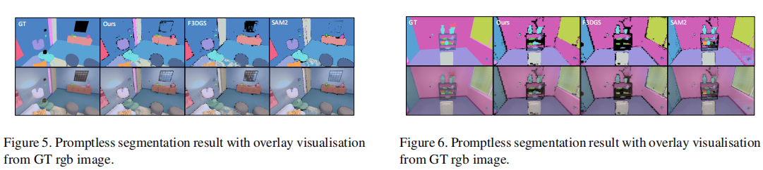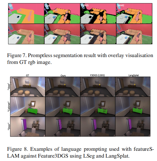 语义分割结果(图 5-8)表明,FeatureSLAM 的无提示分割能准确捕捉物体边界,即使在低纹理区域也能保持语义一致性;语言引导分割支持灵活查询(如 "chair"),分割结果与自然语言描述精准匹配,且支持开放集查询,无需预定义类别。