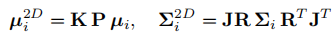 为累积透射率。高斯的 2D 投影受相机内参、投影矩阵等影响,其透明度由投影后的 2D 覆盖范围调制,具体投影关系为: