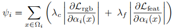 重要性得分计算:融合光度损失与特征损失的梯度贡献,定义高斯重要性得分: