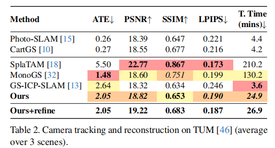 - 跟踪帧仅用于位姿优化,不更新 3DGS 模型;关键帧用于插入新高斯并触发模型优化,平衡地图精度与实时性。