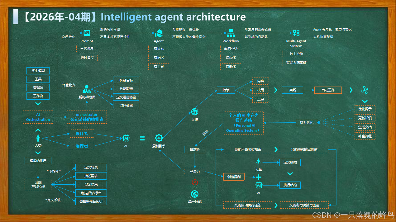 - 用户:作为"指令输入"端,通过"智能代理"与系统交互,实现"既自动执行任务,又能参与决策与改进"的目标。