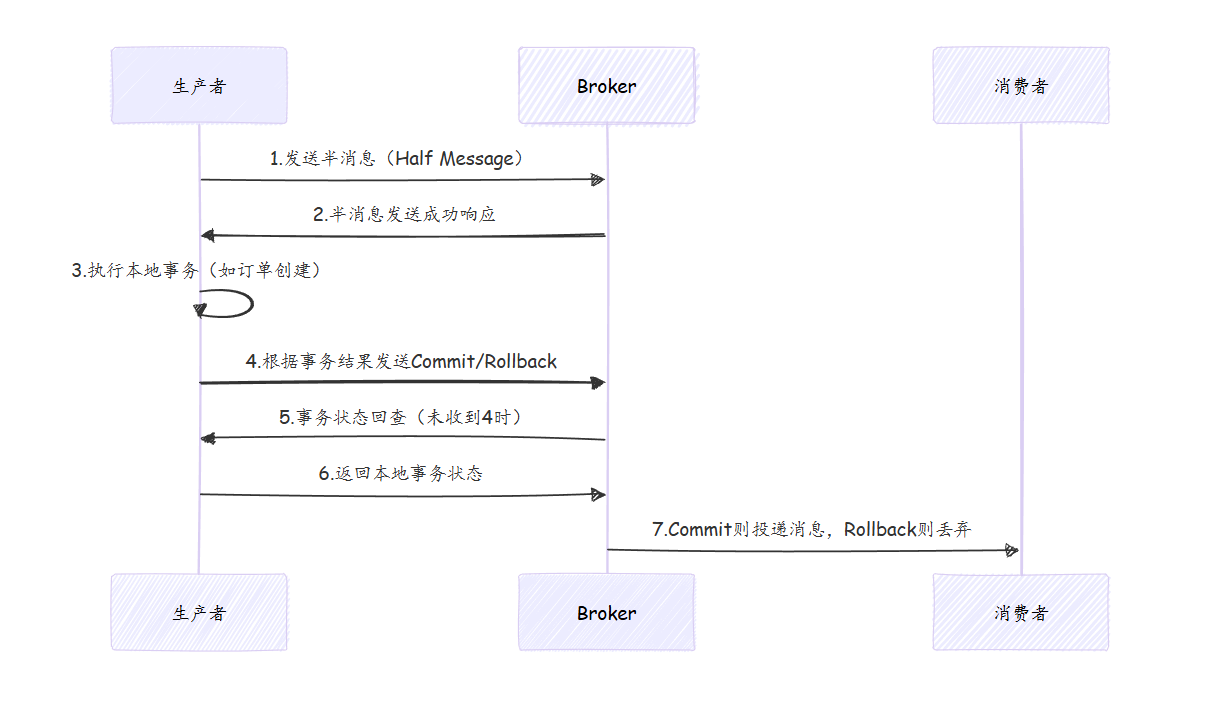 - 兜底机制:Broker 定期回查本地事务状态,避免事务结果丢失