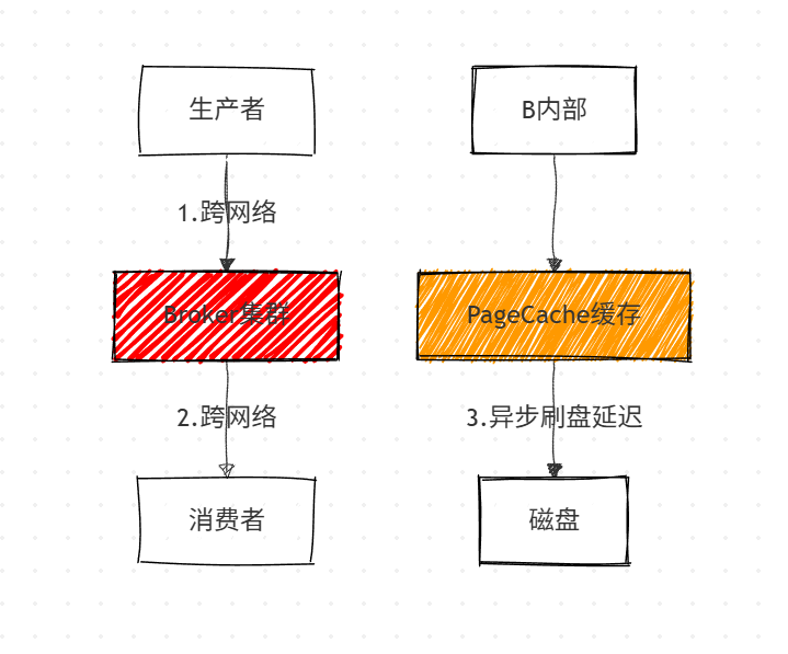 消息链路中 4 个关键丢失风险点,跨网络传输和缓存异步刷盘是主要场景: