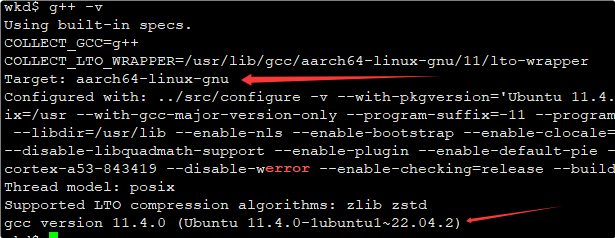 g++编译器的目标平台也是 aarch64-linux-gnu,版本是11.4.0: