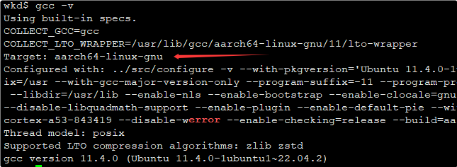 安装后,可以看到gcc编译器的目标平台是 aarch64-linux-gnu,gcc版本是11.4.0: