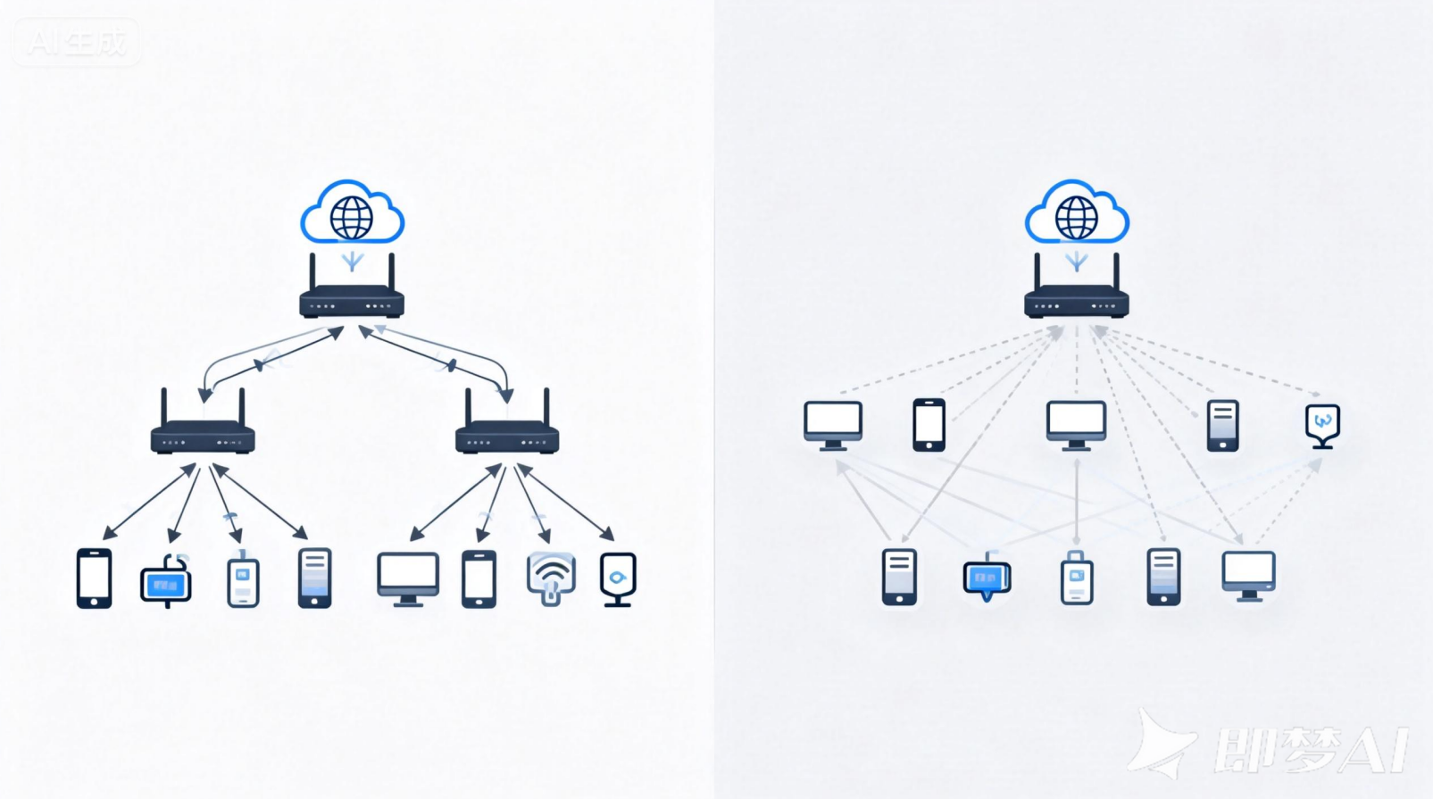 在这种技术下,路由器将不再执行原本的工作内容,也就是停止网络地址转换、DHCP服务器等功能,仅作为信号中继或有线转无线的媒介来用,至于IP地址分配和统一管理等,则是全部交给上级主路由器来操控。
