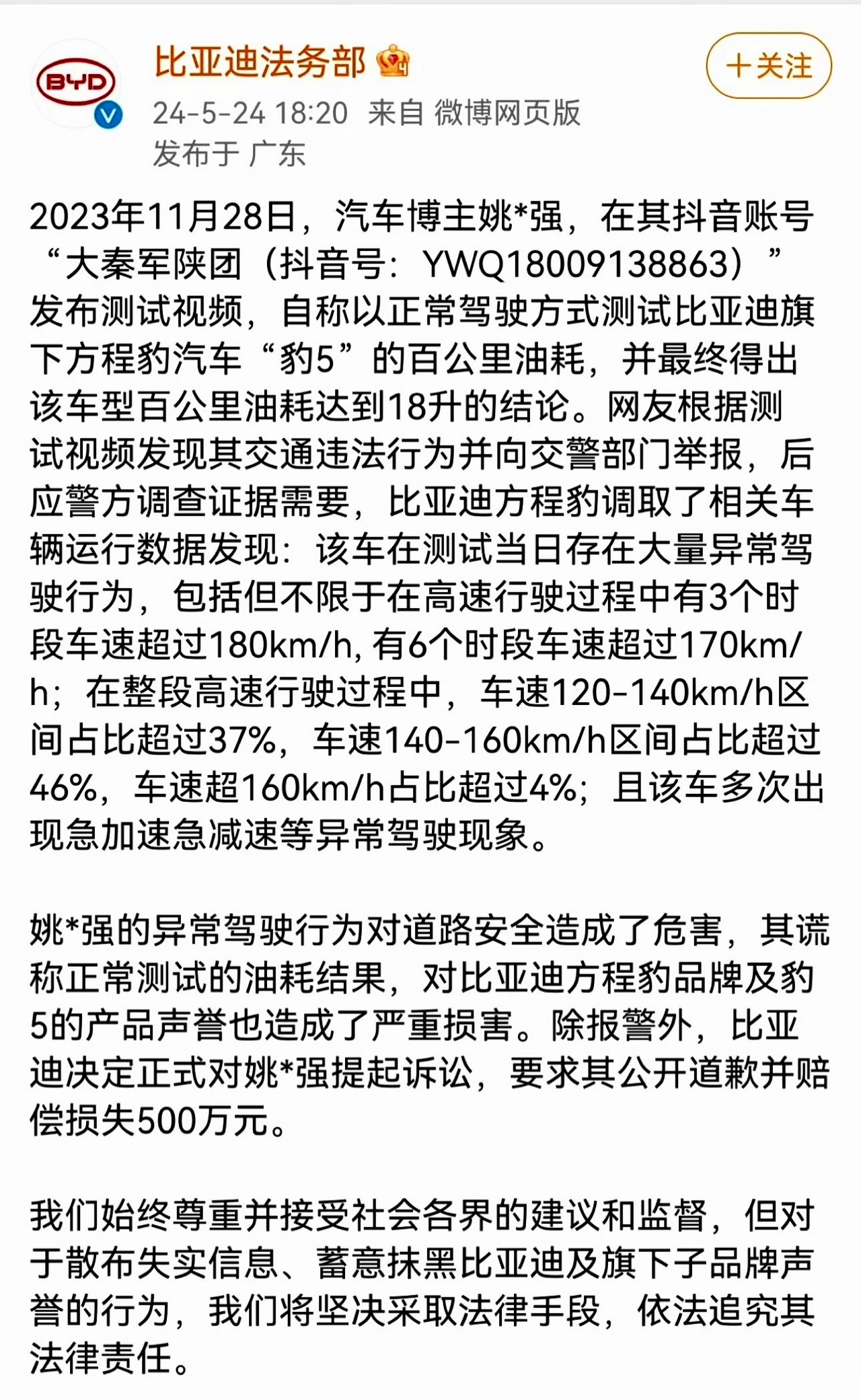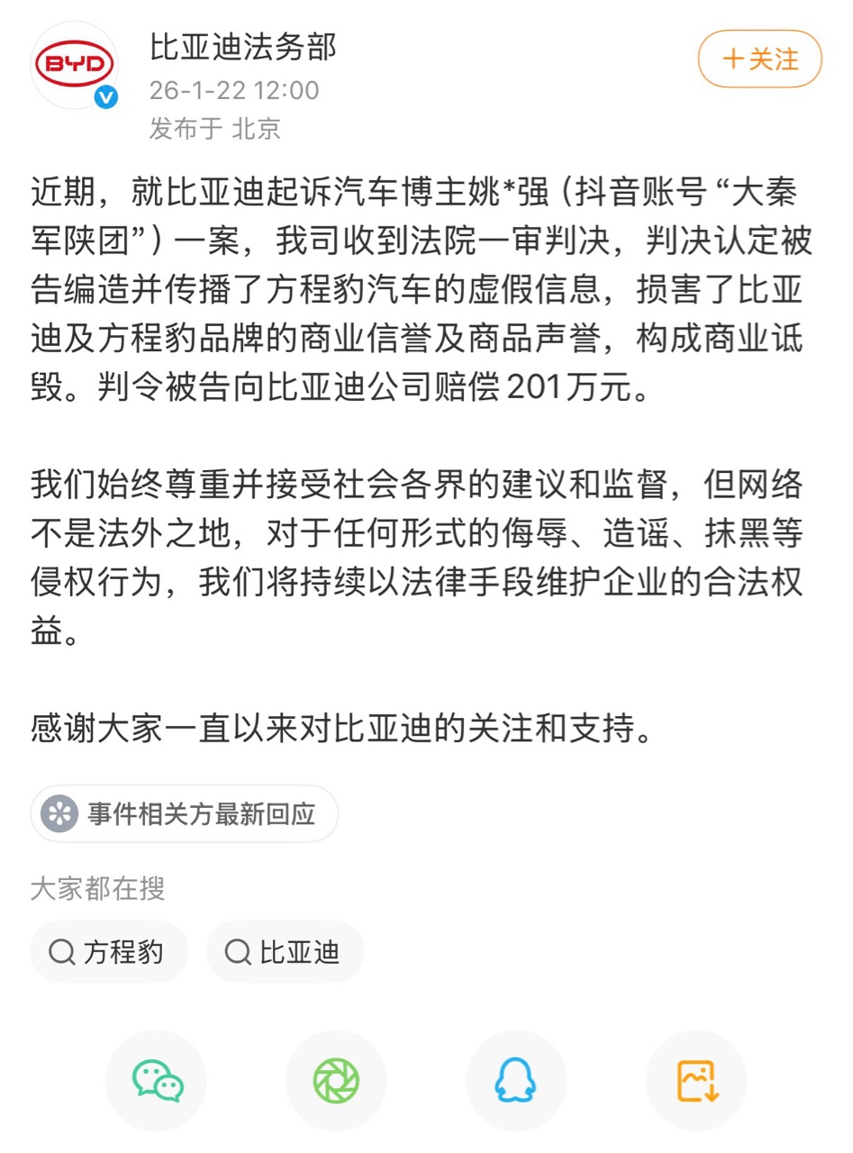 2026年第一大好消息,比亚迪法务部正式公告:法院一审判决认定,抖音博主姚*强(大秦军,人称"姚十八")编造并传播关于方程豹豹5的虚假信息,构成商业诋毁,判赔201万元。